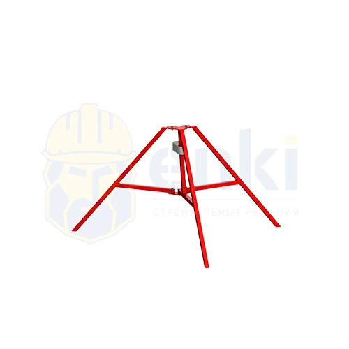 Тренога изготавливается из конструкционной стали с антикоррозионным покрытием порошковой краской. Конструктивно представляет собой разъёмное изделие из трёх опор, расположенных на 120 градусов друг от друга и усиленных рёбрами жёсткости. Центральная ось оснащена крюком-петлёй для фиксации телескопической стойки. Преимущество треноги данного типа – возможность установки вплотную к стенам и колоннам.
